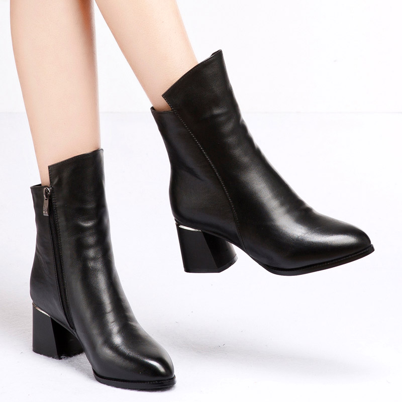 2016秋冬季新款尖头粗跟短靴女高跟真皮加绒中跟马丁靴女靴子女鞋 优质全头层牛皮,品质女鞋