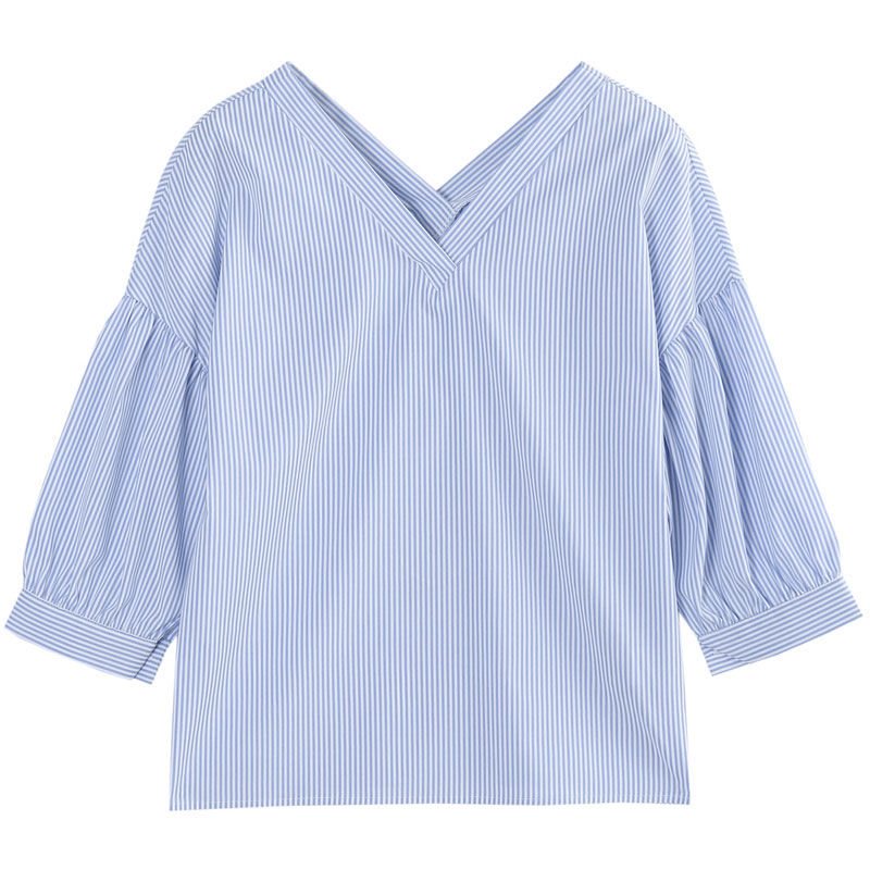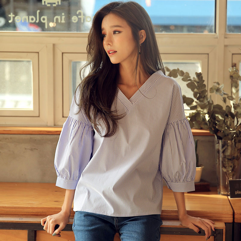 商品名称:韩都衣舍2017韩版女装春装新款条纹显瘦百搭宽松v领七分袖衬衫潮 领券立减/单件包邮/七天无理由退换